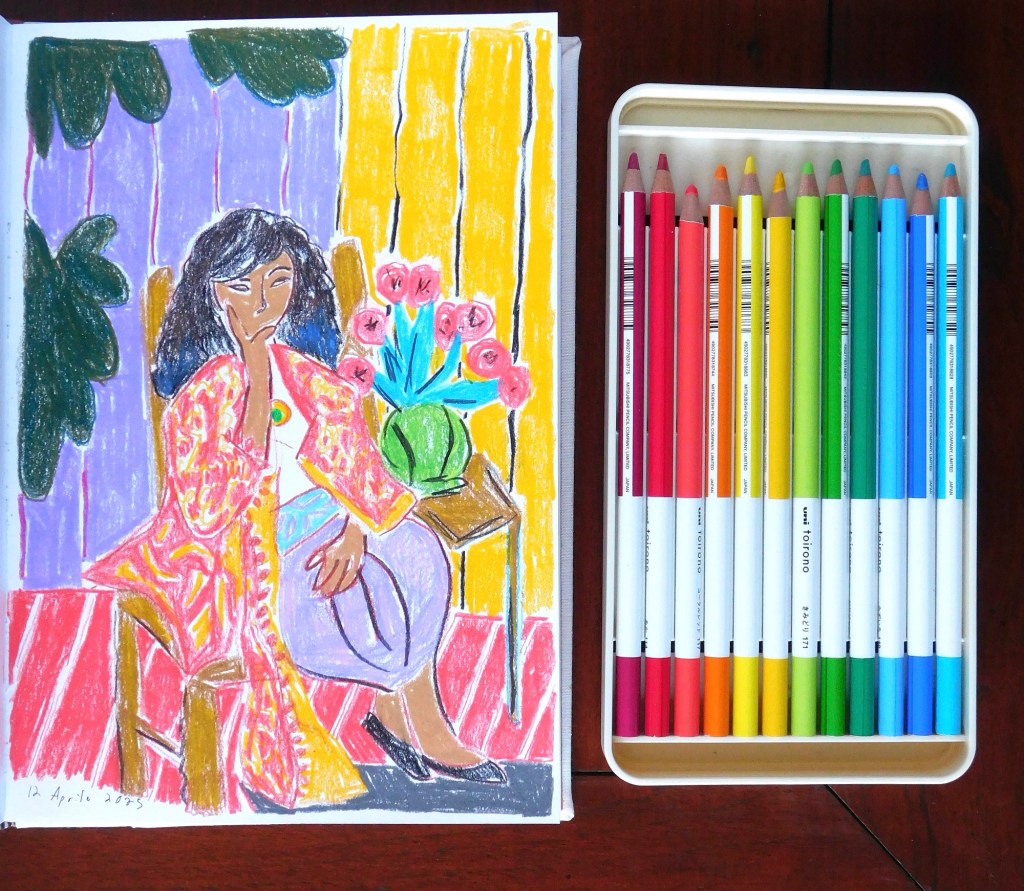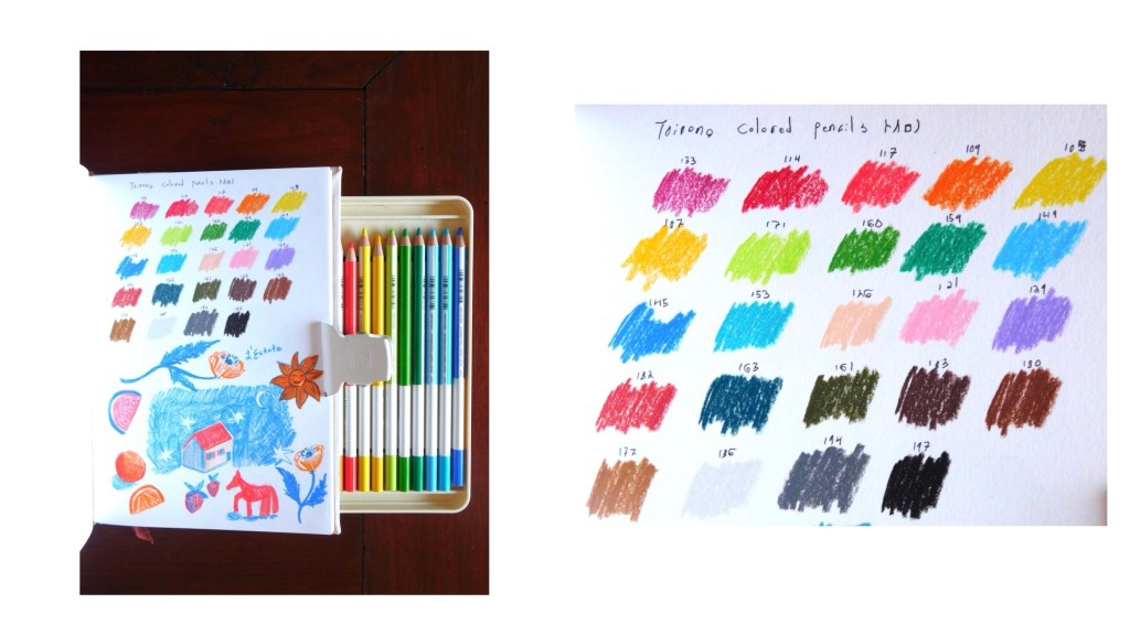 I did buy lots of new art supplies. I think my favorite purchase is a set of Toirono colored pencils (set of 24) . These colored pencils are wax based and are super vibrant. These pencils are made in Japan by Uni Mitsubishi Pencil. It’s been quite a few years since I’ve worked with wax colored pencils, the last ones I used were Prismacolor and I was not satisfied with them. Unlike Prismacolor, the Toirono colored pencils never seem to break, they overlap beautifully and are wonderfully saturated. I will include some artwork and swatch tests I made with these lovely pencils. I like to keep this set of pencils on my desk at all times. They are great for both quick studies and\or finished pieces.