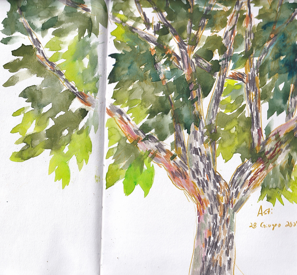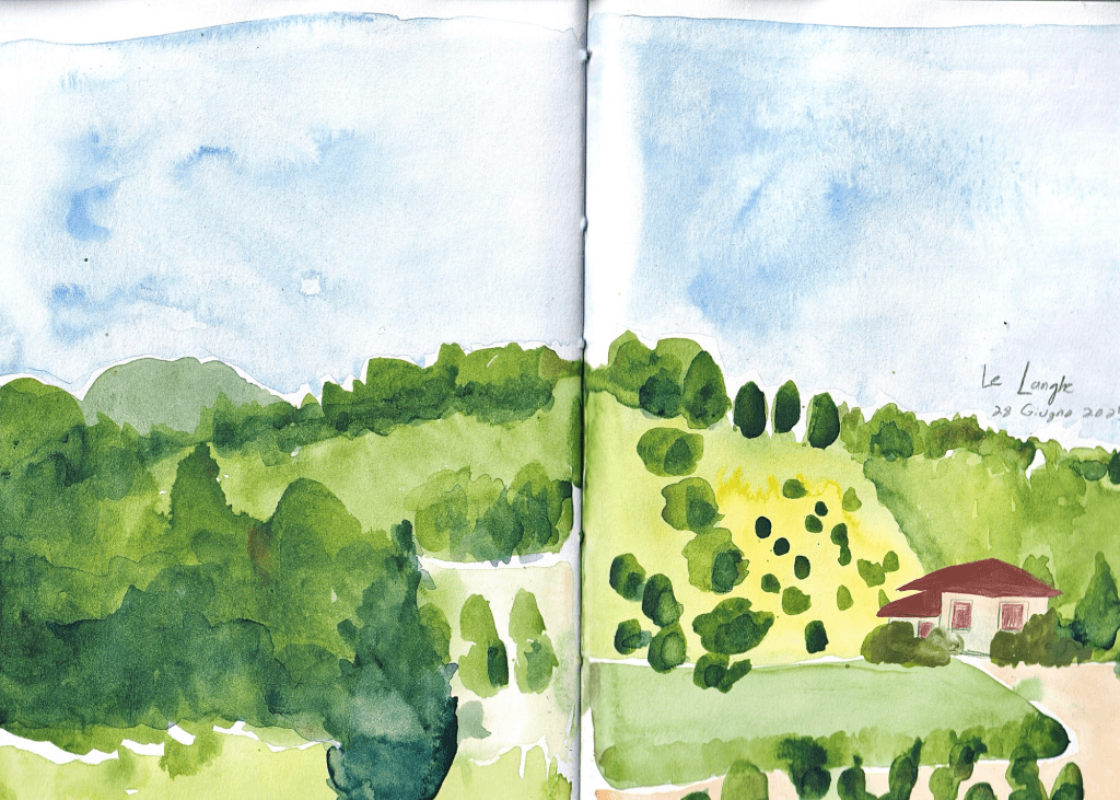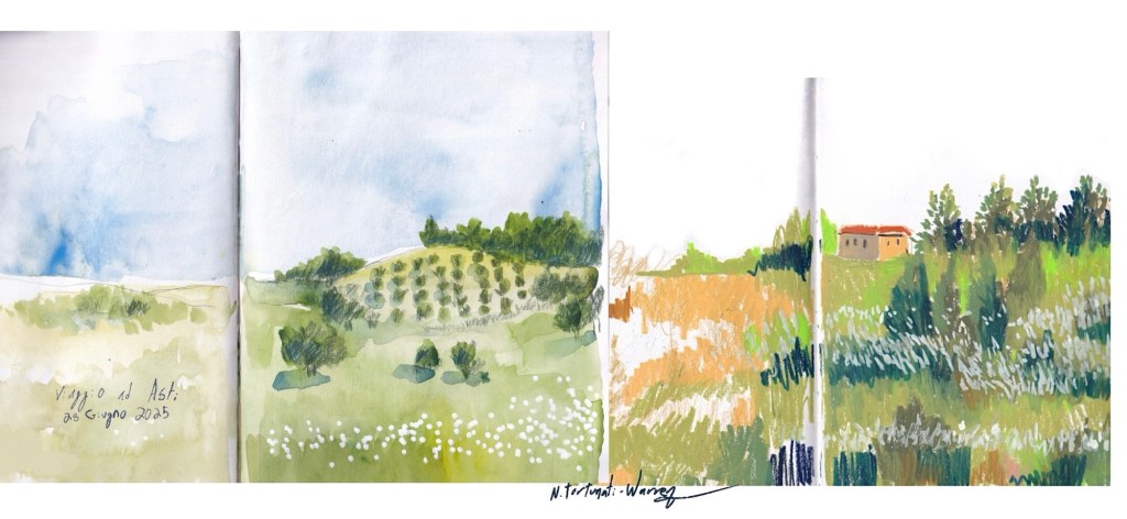 We went to a local restaurant named Il Grillo – They have lovely rustic dishes. I sketched and painted the surrounding area. Eating at this bistrot was a highlight of my trip.