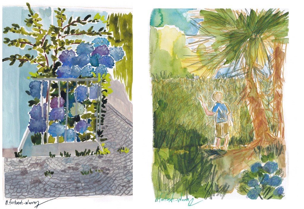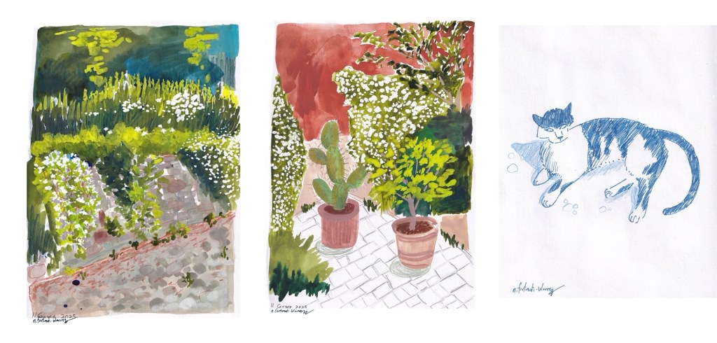 During this visit I spent most of my time drawing and painting on my Grandma’s terrace, which is one of my favorite places in the world. My Grandma is an avid gardener, so she has a very large variety of plants – some of which are Mediterranean staples, so a very large number of the artwork I made during this visit is botanical-related.